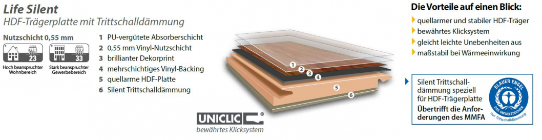 Mit unserem geräuscharmen objektPlus vinylBoden entsteht ein harmonisches Klangbild in ihrem Zuhause. Das sanfte und leise Auftreten schont nicht nur die Ohren, sondern auch ihre Nerven.
